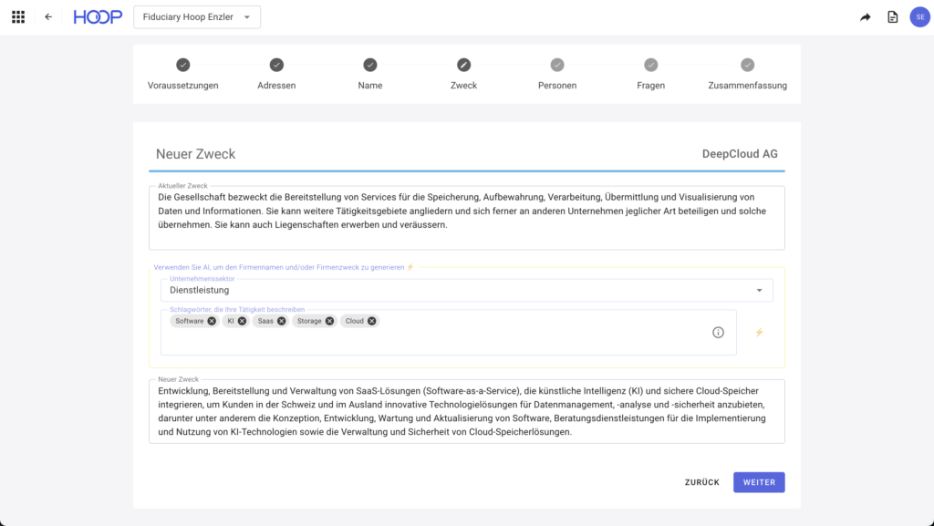 Hoop setzt gezielt auf KI-Unterstützung genau dort, wo Gründerinnen und Berater erfahrungsgemäss am längsten überlegen: bei der Formulierung des Unternehmenszwecks und bei der Namensfindung. Basierend auf strukturierten Angaben zur Tätigkeit schlägt die KI-Formulierungen für den Firmenzweck vor, die sich an üblichen Schweizer Handelsregister-Standards orientieren und gleichzeitig zum Geschäftsmodell passen.