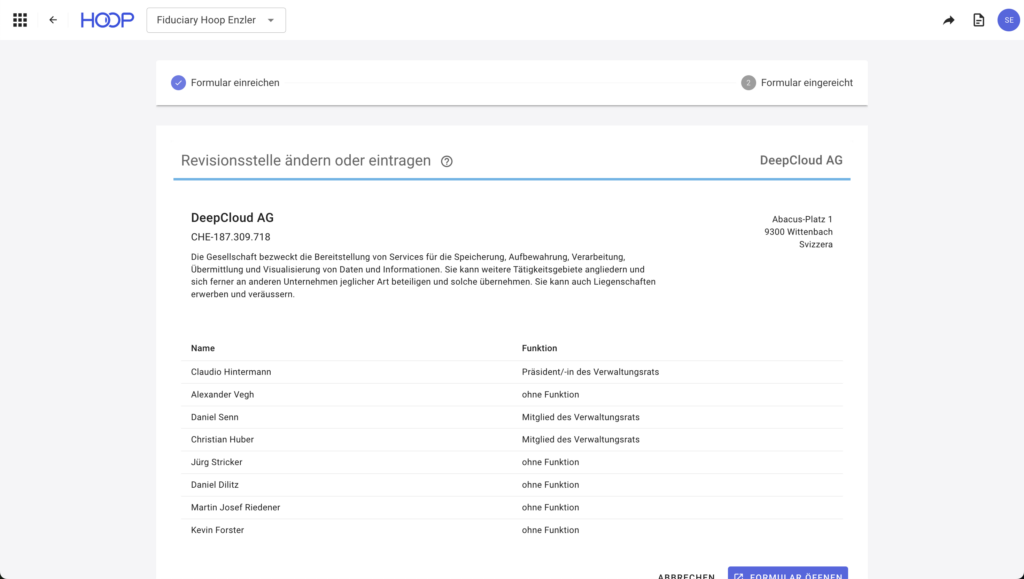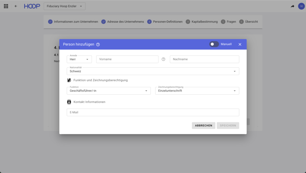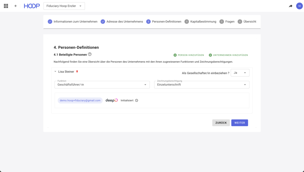 Die Identifikation von beteiligten Personen und die Vollständigkeit ihrer Daten zählen zu den kritischsten und zeitintensivsten Schritten jeder Gründung. Hoop vereinfacht die Personenerfassung weiter, etwa durch klar strukturierte Eingabemasken für Organe, Gesellschafter und wirtschaftlich Berechtigte sowie eine direkte Anbindung an DeepID zur digitalen Identitätsprüfung. So können sich auch Personen ohne Schweizer Wohnsitz online identifizieren, ohne physisch vor einem Notar erscheinen zu müssen.