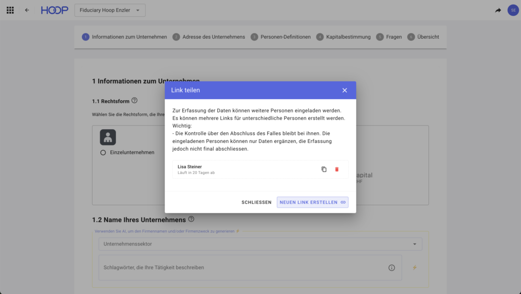 Mit der neuen Sharing-Funktion können Treuhänder, Anwältinnen und Unternehmensjuristen ihre Mandantinnen und Mandanten gezielt in einzelne Schritte des Erfassungsprozesses einbeziehen, ohne den Gesamtprozess aus der Hand zu geben. Statt Daten mühsam per E-Mail oder PDF abzufragen, wird ein sicherer Online-Zugriff auf genau die benötigten Felder freigegeben – zum Beispiel für Personalien, wirtschaftlich Berechtigte oder spezifische Unternehmensangaben.