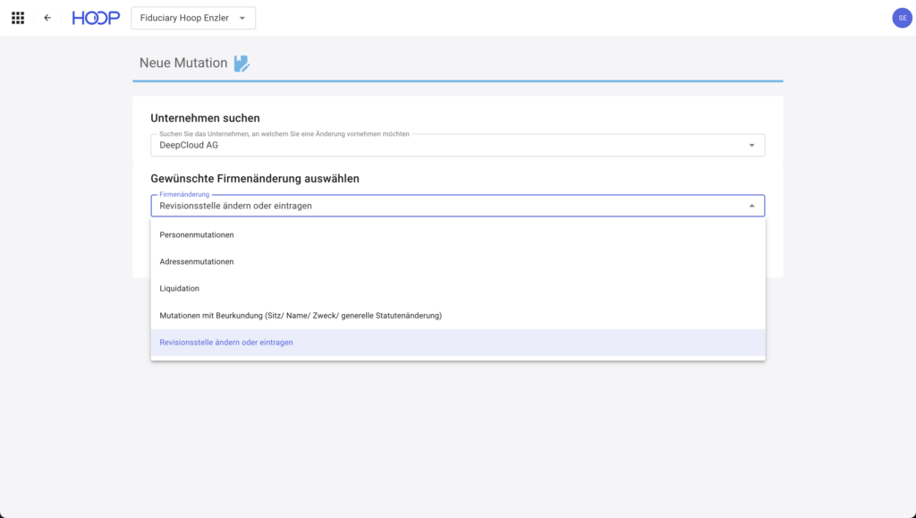 Hoop digitalisiert nicht nur Gründungen, sondern auch Handelsregisteränderungen – dazu gehört auch die Änderung der Revisionsstelle. Neu kann diese Mutation direkt in der Plattform angestossen und an Hoop beauftragt werden, statt den Vorgang in separaten Dokumenten oder externen Tools zu orchestrieren.