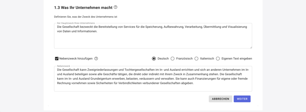 Zusätzlich lässt sich nun optional ein Nebenzweck definieren, um das Geschäftsfeld der Gesellschaft differenzierter und praxisnäher abzubilden – ein Vorteil insbesondere für Startups und KMU mit mehreren Businesssträngen. Durch die Kombination aus vereinfachter Personenerfassung, digitaler Identifikation und sauberer Zweckstruktur sinken Fehlerquoten und Rückweisungen des Handelsregisters während des gesamten Gründungsprozesses.